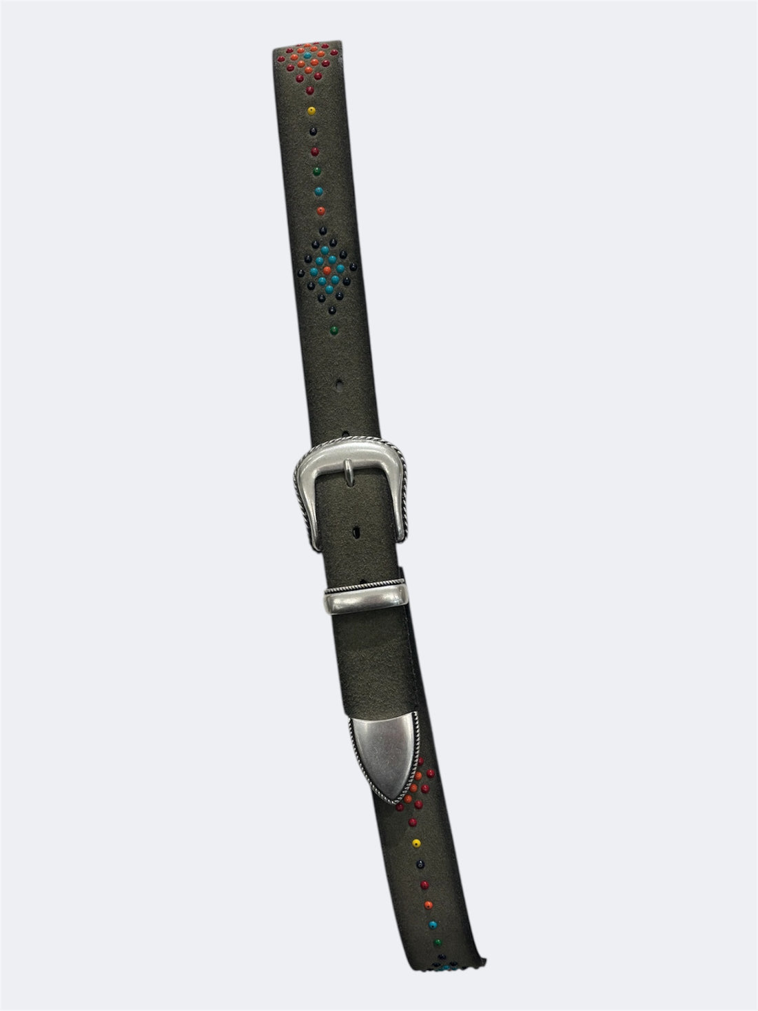 Cintura modello Western,in camoscio verde con applicazioni multicolor.Trittico in finitura argentata.
