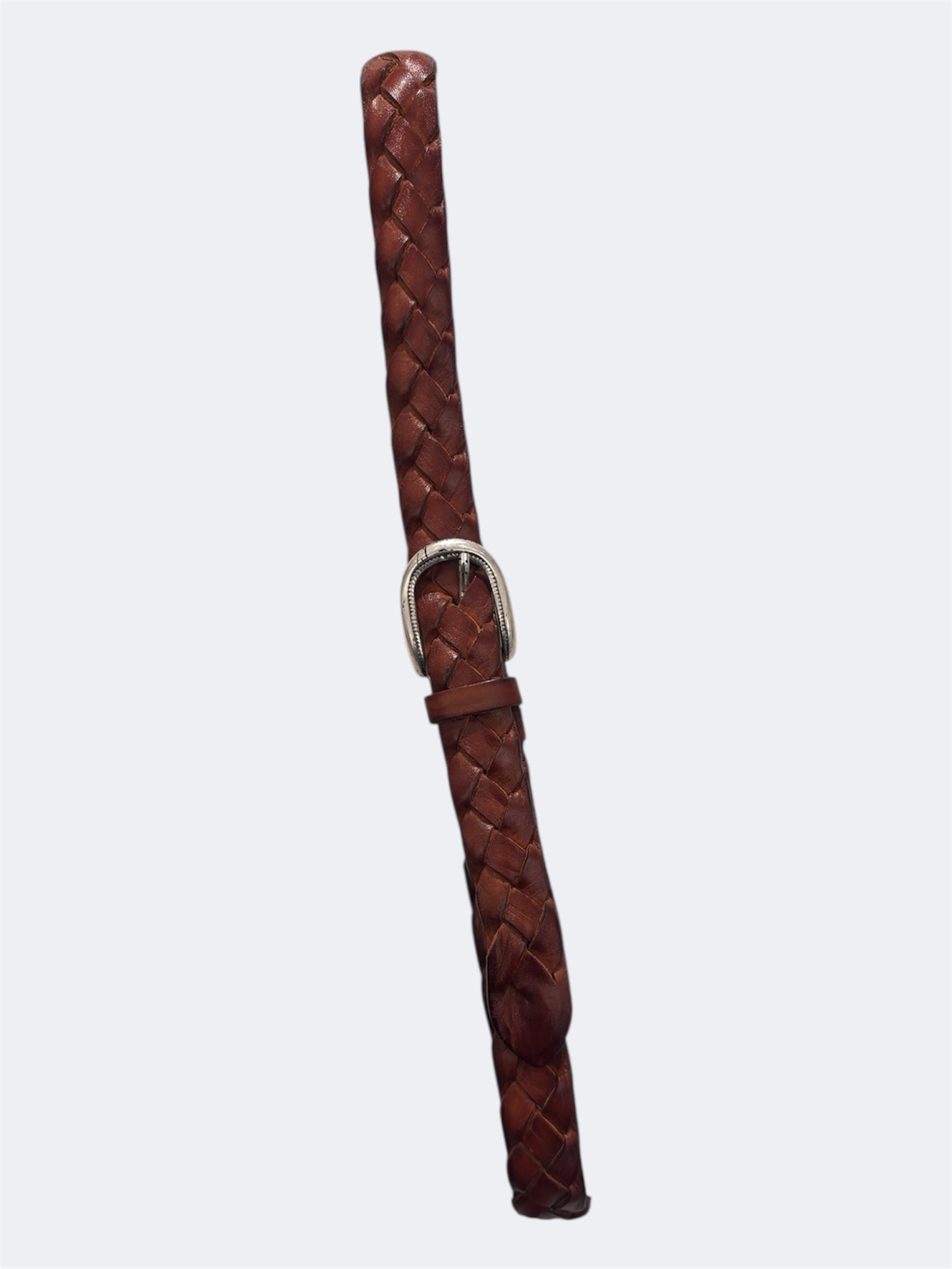 Cintura a treccia in pelle 100%, tinta in capo ed intrecciata a mano. Altezza cm 3 con fibbia e passante in metallo.Colore cuoio