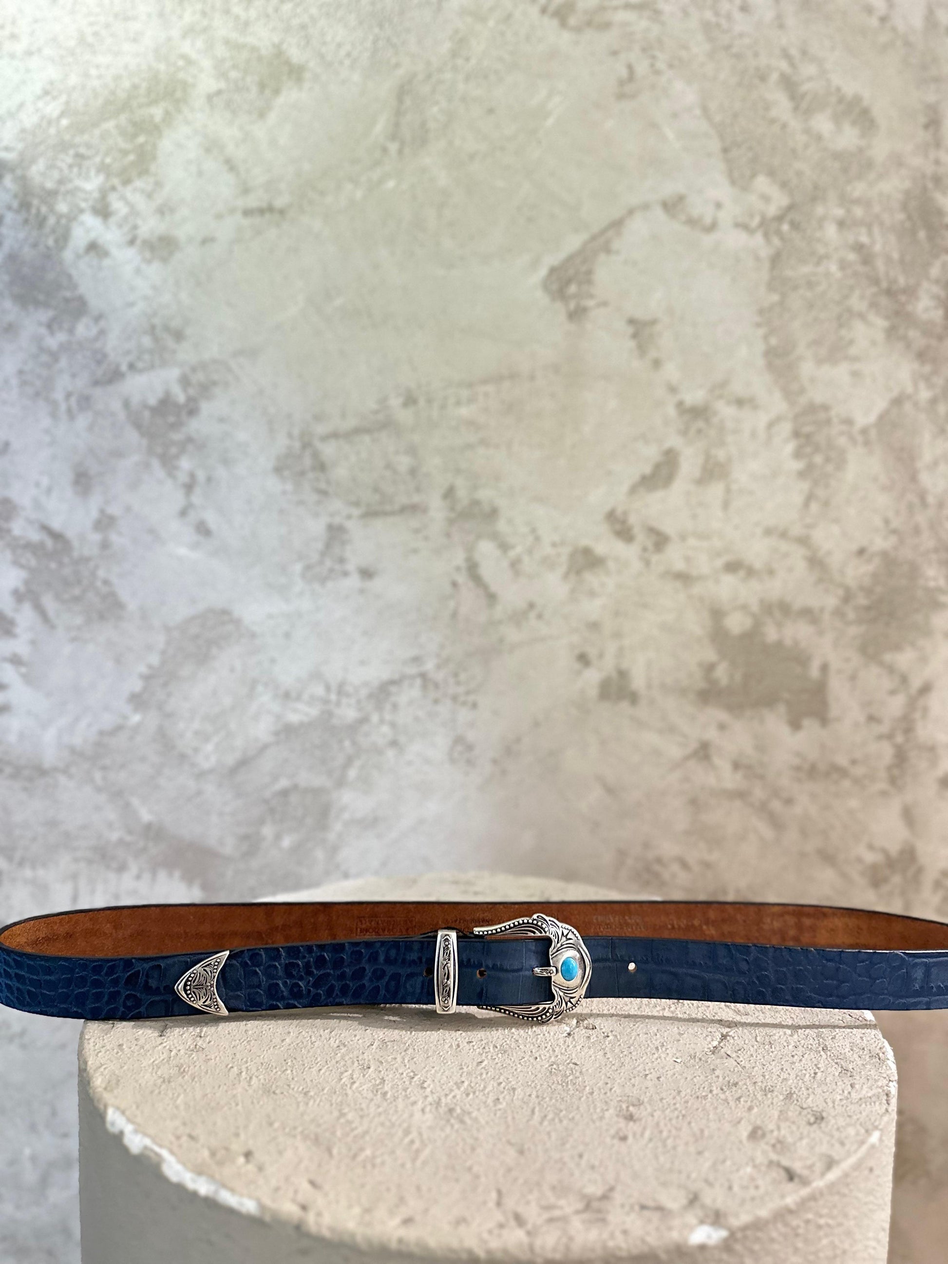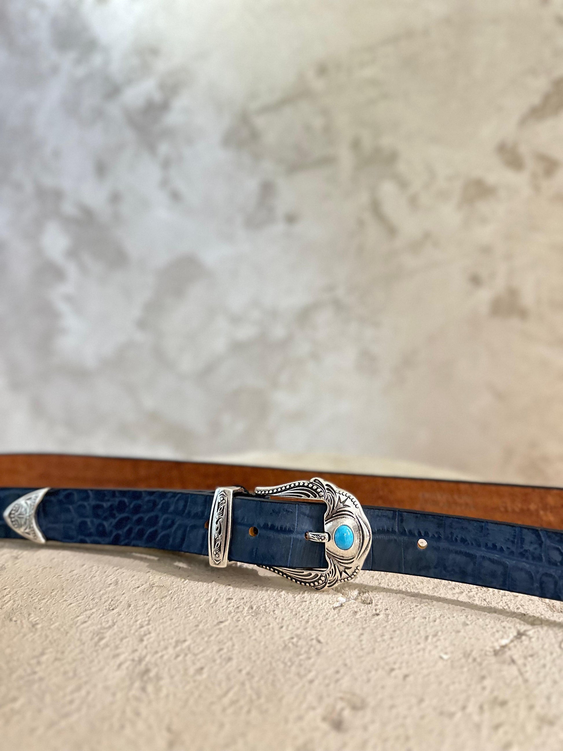 La cintura ANTONIO DE PATRIZI in pelle blu presenta un trittico inciso con finitura argentata, arricchita da un corallino turchese. Questa combinazione di materiali e dettagli non solo offre un aspetto estetico raffinato, ma garantisce anche una resistenza e durabilità superiori, ideale per un uso quotidiano.