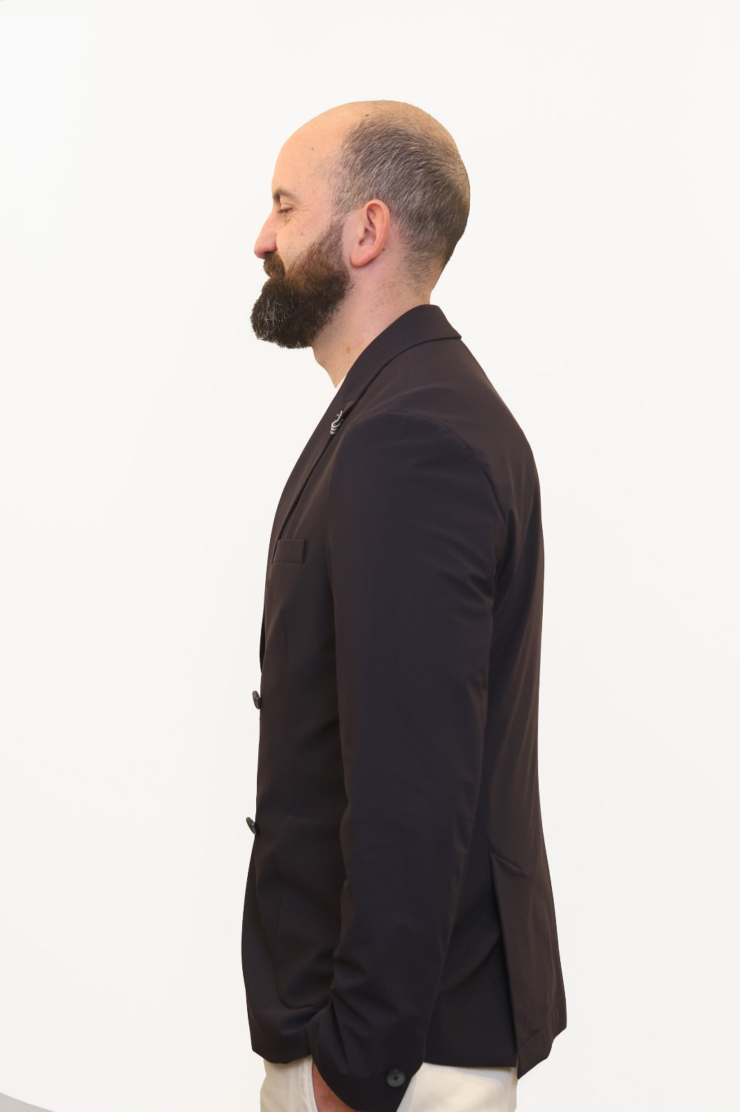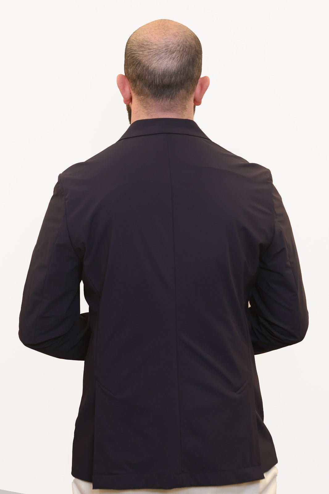 Giacca doppiopetto realizzata in tessuto tecnico super stretch "HP High Perform", che garantisce alte performance in termini di elasticità e comfort. Il capo presenta un’abbottonatura centrale con asole e bottoni, tasche frontali a toppa e taschino a pistagna sul petto.