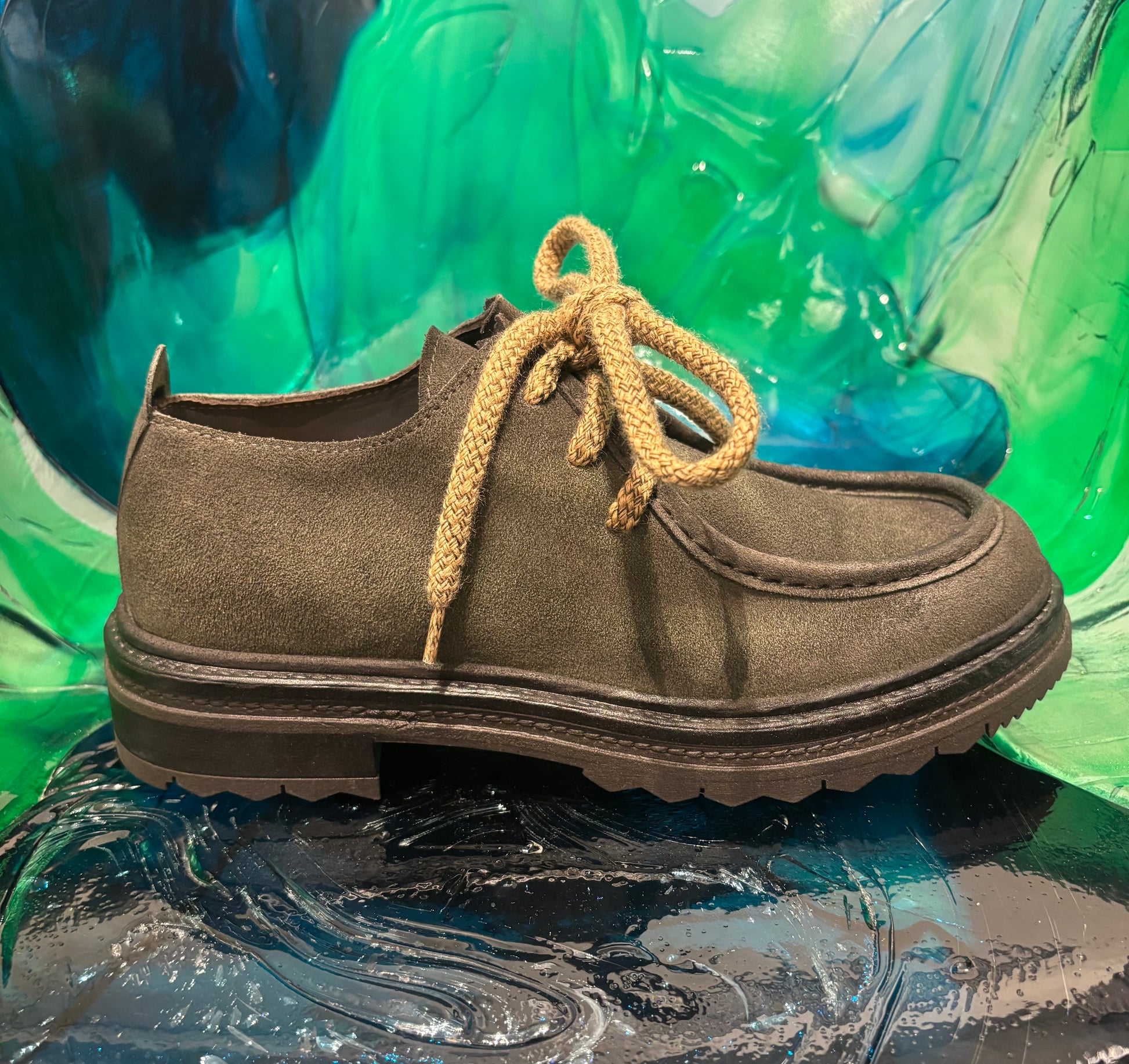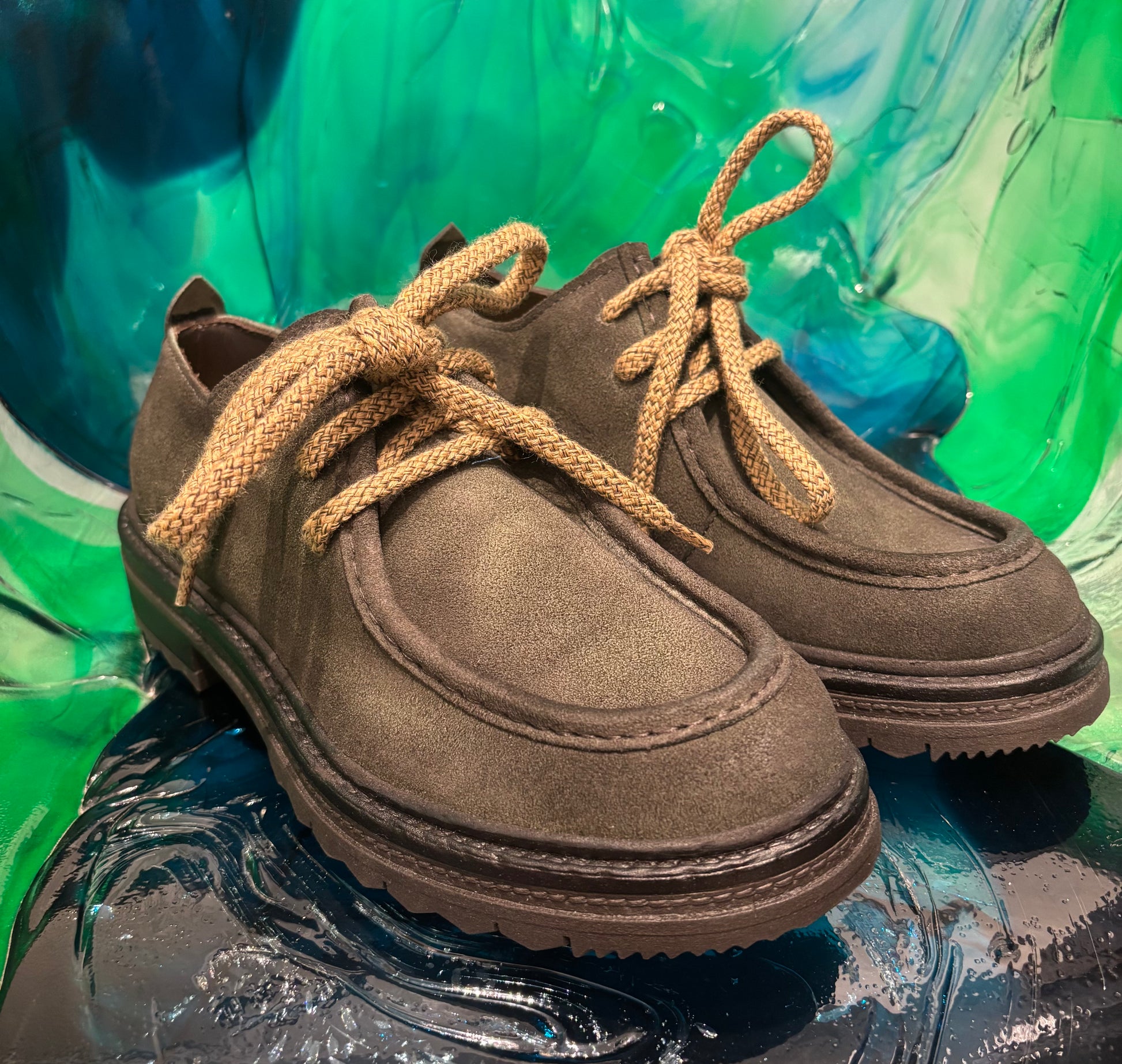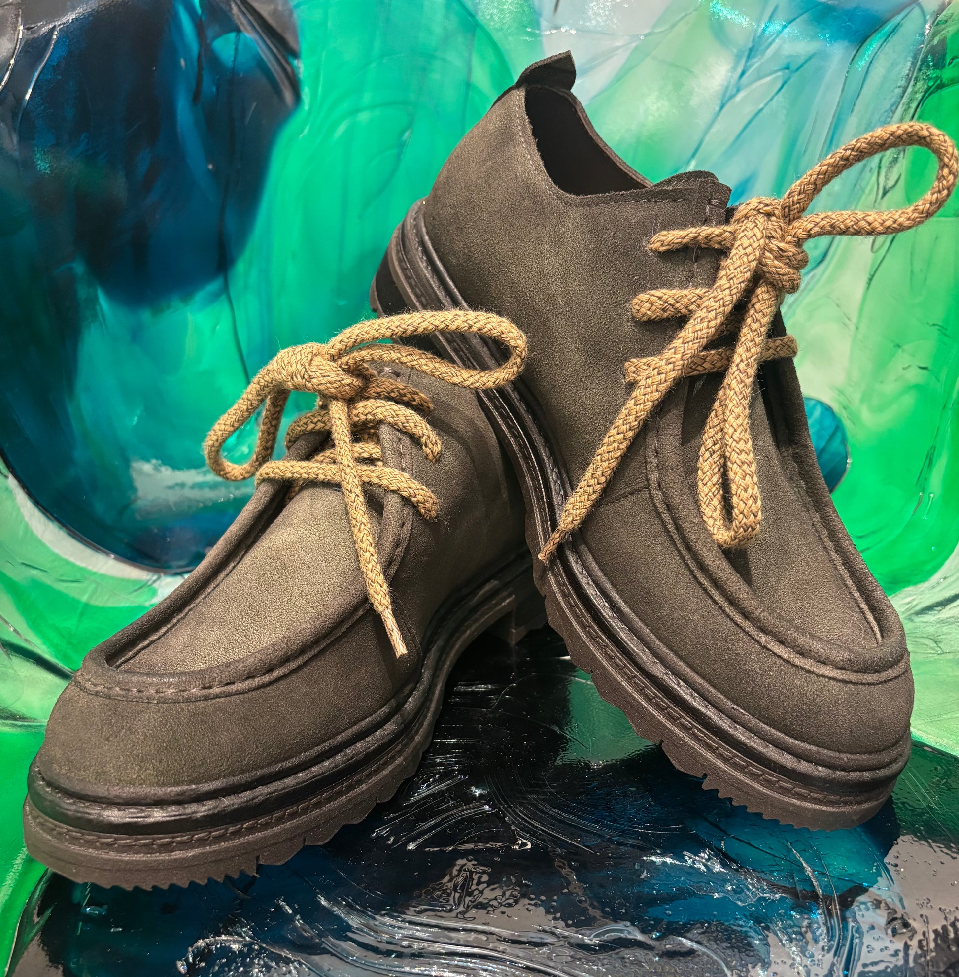 Stringate in camoscio verde con lacci a contrasto beige,modello ingegnere.Soletta removibile.